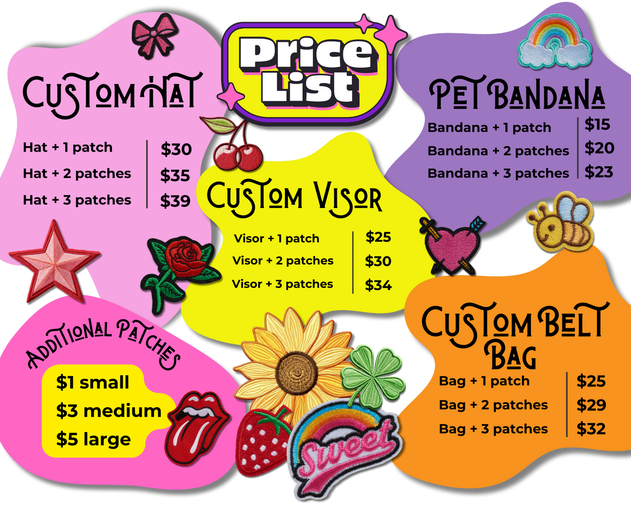 Custom hats, belt bags, dog bandanas, t-shirts & denim!